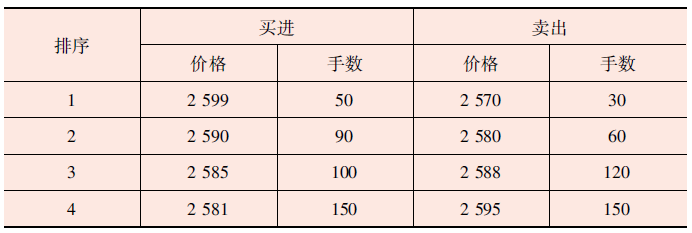 某合約申報排序如下表(最小變動價位為11元)。 表 某合約申報排序 配對情況為:排序為1的買進價高于排序為1的賣出價,成交30手;排序為1的買進價還有20手沒成交,由于比排序為2的賣出價高,成交20手;排序為2的賣出價還有40手沒成交,由于比排序為2的買進價低,成交40手;排序為2的買進價還有50手沒成交,由于比排序為3的賣出價高,成交50手;排序為3的賣出價還有70手沒成交,但是,由于比排序為3的買進價高,已經(jīng)無法成交。這樣,最終的開盤價就是2588元,在此價位上成交140手(如按雙邊計算則是280手)。